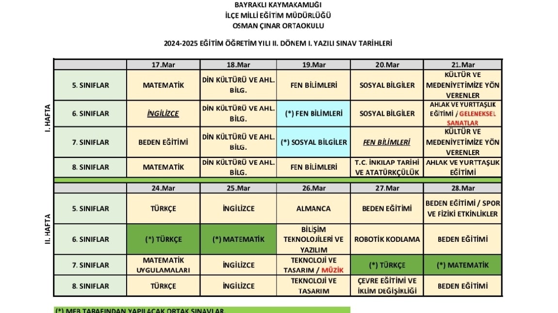 2024-2025 Eğitim-Öğretim Yılı 2. Dönem 1. Ortak Sınav Takvimi